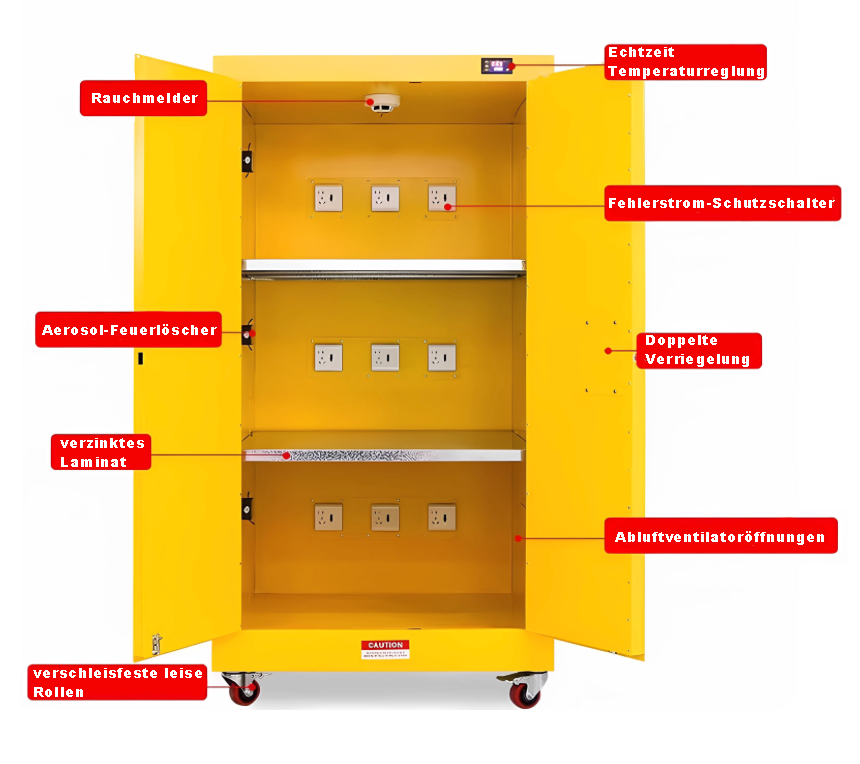 Erstens gewährleistet der Einsatz von Sicherheitsschränken zum laden und lagern von Batterien die Sicherheit der Batterien während des Ladevorgangs. Moderne Lithiumbatterien neigen dazu, während des Ladevorgangs aufgrund von Überladung, instabilen Strömen oder aus anderen Gründen zu überhitzen und sogar Feuer zu fangen. Sicherheitsschränke zum Laden von Batterien mit ihrem feuerfesten und explosionsgeschützten Design verhindern diese Unfälle wirksam. Die Temperaturüberwachung und die automatischen Feuerlöschsysteme in den Schränken erhöhen die Sicherheit des Ladevorgangs zusätzlich und ermöglichen es den Benutzern, verschiedene elektronische Geräte bedenkenlos zu verwenden.